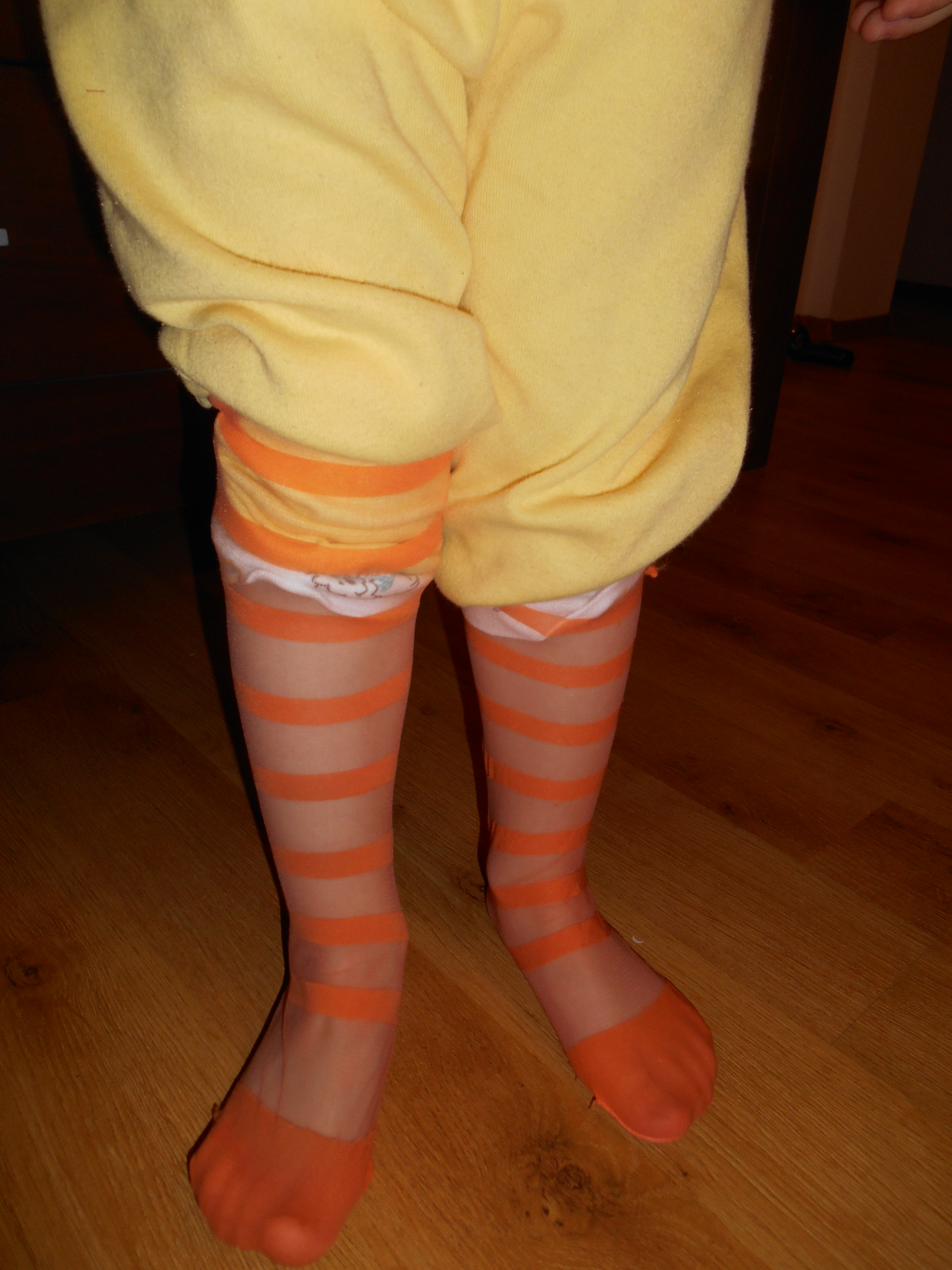 cuprinsa de el. Seara, dupa baie, ne imbracam in rochiile de vara peste pijamale, ne dam cu strugurel cand iesim afara, ne pieptanam si ne punem clame, margele, bratari si bentite (ce-i drept inca nu a inteles ca trebuie sa ne accesorizam cu masura, nu cu toate deodata, dar o sa deprinda si masura bunului gust), ca atare, alaltaieri seara, a dat peste o pereche de dresuri colorate de-ale mele si a fost foarte mandra ca am lasat-o sa le probeze. Tatal ei o intreaba:
