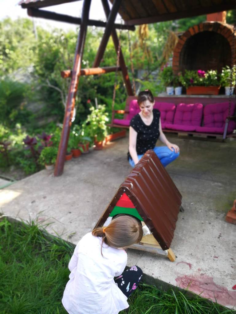 La curte în schimb, percepția celei mici s-a schimbat total. I-am făcut o căsuță stil cabană de vacanță (asa a numit-o Iris). Tati a construit-o, noi două am decorat-o. Cosmy are spațiu de joacă, stă fără lesă, ca atare a învățat ușor o mulțime de lucruri.