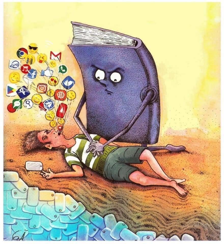 In ultima vreme, ajutata de contextul pandemic, am observat cum creste timpul petrecut pe telefon, in social media, si, totodata, adictia catre acest mod de petrecere a timpului, in special seara. Si-am simtit cum incep sa ma inec. Ma afundam in marea de stiri, voci si imagini postate de prietenii si influentatorii alesi chiar de mine. Simteam ca nu ma mai pot relaxa. Si deodata mi-am amintit de aceasta poza. Am gasit-o (tot pe Facebook parca) acum vreo 2 ani cred si am salvat-o in cloud, caci m-a impresionat. Din pacate nu am salvat si autorul, asadar daca stiti cui apartine,va rog sa impartasiti informatia, sa il felicitam.